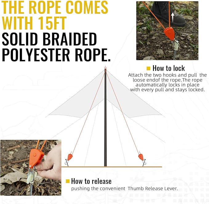 • 【USAGE METHOD】How to lock: Attach the two hooks and pull the loose end of the rope.The rope automatically locks in place with every pull and stays locked.How to release: pushing the convenient Thumb Release Lever.
