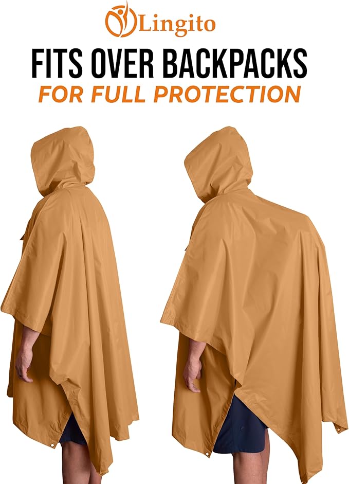 - VARIETY OF USES: Lingito's hooded rain ponchos aren't just meant to be worn, they offer multiple ways that can protect you from outdoor elements. You can use it as a camping blanket if in case the ground is wet, or you can prop it up above as a sun shade. The ponchos come in a 3.5' x 9' bag and weighs only 11 oz. Put it in your book bag, duffle bag or purse and be ready for any trip.