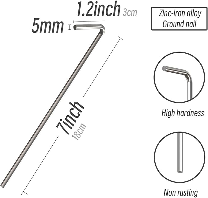 - Size - The thickness of tent stakes is 5mm. Length 18 cm / 7 inches; 32 g / 1.12 oz per unit. Specially designed metal tent stakes can accommodate a variety of tents and landscape objects.