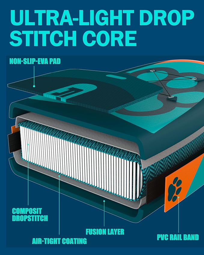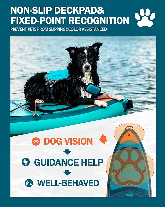 • 【Anti-slip & Anti-scratch Pad】Non-slip EVA deck pad of the inflatable paddle board is covered at the forth end,makes sure your dog doesn't go sliding off when you hit a wave.The important feature is anti-scratch pad for dog, making a dog stay on the front of the paddle.
