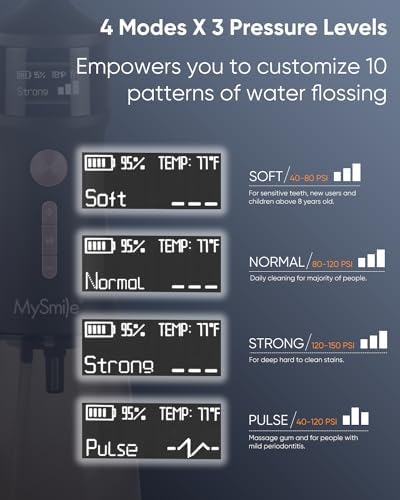 - CUSTOMIZABLE PRESSURES & READABLE DISPLAY - Benefit by 4 modes-Soft, Normal, Strong and Pulse and 3 pressure levels (Exclude pulse mode) to set, you are able to customize 10 patterns of water flossing; A larger OLED display indicates what you want: Battery power, water temperature, mode and pressure level; thereby you are ready to charge the machine in time, regulate water temp based on your teeth sensitivity, as well as select proper mode and pressure for your appeal on teeth cleaning