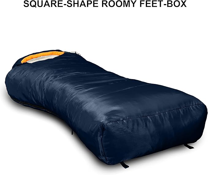 - OVERSIZED DIMENSIONS FOR ALL CAMPERS: No need to feel cramped! Our extra-long (90.2 inch) and wide (37.5 inch) sleeping bag accommodates all sizes, providing a spacious interior for a restful night's sleep. Whether you're camping, traveling, or hiking, the added comfort of a roomy square feetbox means more room to stretch out and relax in a natural sleeping position and more warmth where you need it