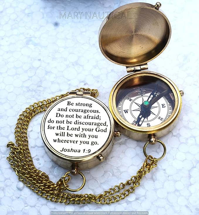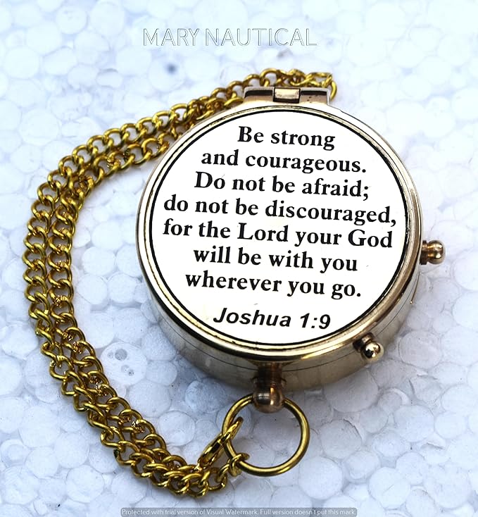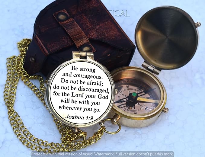 - Product Specifications: The compass with the leather case has a message from the Bible engraved on its outside. It says “Be Strong and Courageous Do not be afraid; do not be discouraged, for the Lord your God will be with you wherever you go. - Joshua 1:9”. The compass measures 2.36 x 1.97 x 0.71 inches and weighs120 gms.