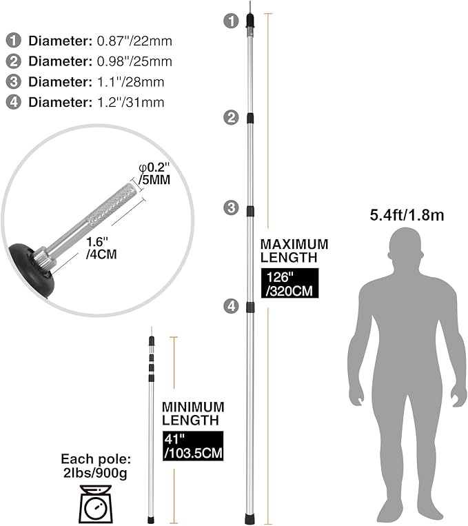 - Uniqueness: Our upgraded aluminum tent pole (total length: 3.2m≈10.5FT) features a unique spiral structure and 4 adjustable sections that can be retracted together at the same time. (Note: 3-section or 5-section adjustable tent poles are available in our store.)
