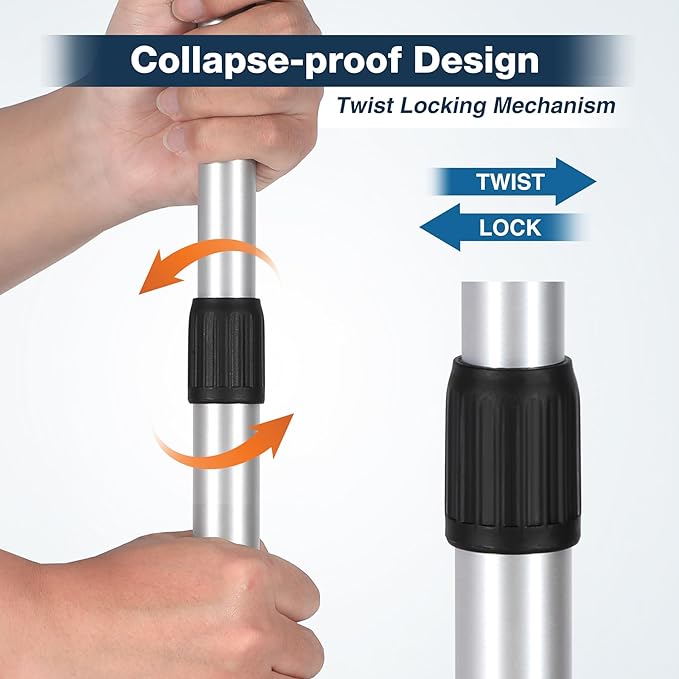 - Twist Lock Mechanism: Simple twist lock system makes it easy to set-up. Just extend it to the proper length and rotate to the right and tighten it. Shrink to the shortest length for easy storage in the included storage bag.