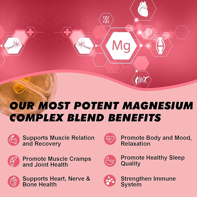 - 【BONES MUSCLE & RELAXATION SUPPORT】 - Magnesium supplement is essential for many body functions and maintaining healthy levels, which are essential for brain, muscle health, bone health, mood, motivation, and focus. Magnesium glycinate complex can also help energy support restful nights, relieve occasional stress, and promote overall relaxation.