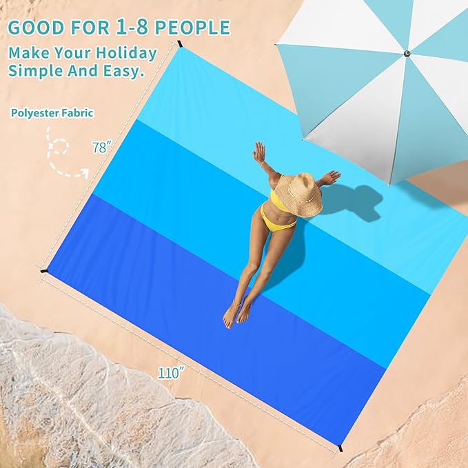• 🌴Beach Blanket Waterproof Sandproof:78''×110''size beach blanket,suit for 1-7 adults.Made by parachute fabric,odorless,tear-resistant 210T polyester.Light weight and small after folding.Only 15 oz,small and mighty,which is easy to carry!