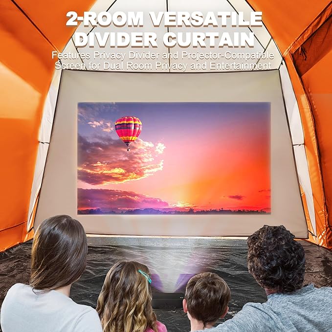 - [2-Room Tent with Outdoor Cinema Feature] This family tent features 2 separate rooms and a central living area. Each room has its own entrance for privacy, and the shared space is suitable for family activities. It's ideal for group camping, providing a balance of privacy and togetherness. The divider curtain can also serve as a screen for an outdoor cinema