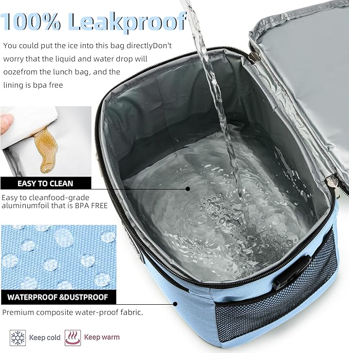 - Insulation/Cooling:Insulated lunch bag for women men is lined with food-grade PEVA material, filled with thicken insulation pearl cotton inside, and 600D polyester composite fabric on the outside, small lunch cooler bag is designed with triple insulation to keep food cold/warm /Fresh for hours, even better if you put an ice pack on the bottom, perfect for meals on the go, picnics, office lunches, road trips, the beach, and more.