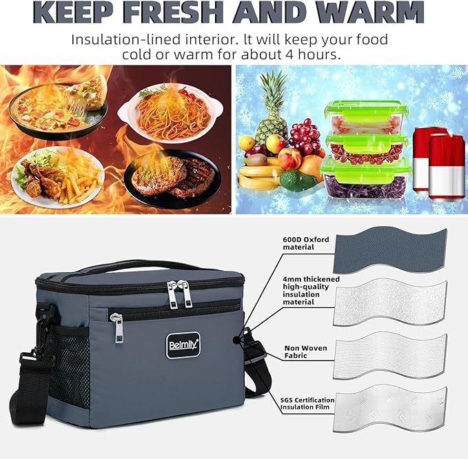 BEIMILY Lunch Box for Men/Women,Small Insulated Lunch Bag,Reusable LunchBox for work Picnic Hiking Beach,Leakproof Soft Cooler Tote Bag Organizer with Adjustable Shoulder Strap for Adults(Gray)