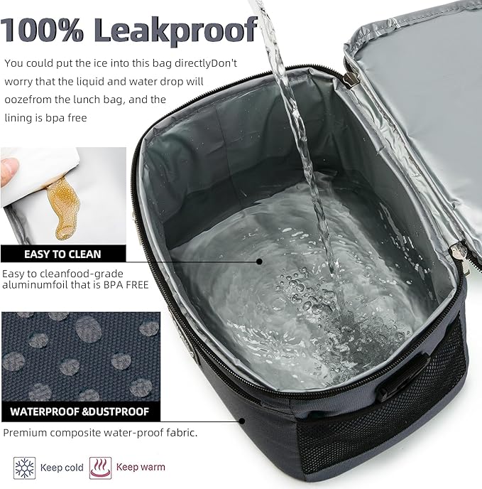 • Large capacity lunch bag:8L men's and women's insulation lunch bag, the size is 10.2 × 6.8 × 7 inches, which can accommodate 12 bottles of 335 ml. The soft cooler lunch bag provides you with spacious storage space. You can put in lunch, snacks, drinks, lunch boxes, food containers, condiments, fruit salads, etc. The front pockets are placed in a tableware, a napkin, a bottle, a wallet, a key and other necessities, and then placed the water bottle or energy drink in the side grid pocket.