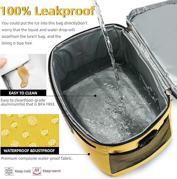 - Insulation/Cooling:Insulated lunch bag for women men is lined with food-grade PEVA material, filled with thicken insulation pearl cotton inside, and 600D polyester composite fabric on the outside, small lunch cooler bag is designed with triple insulation to keep food cold/warm /Fresh for hours, even better if you put an ice pack on the bottom, perfect for meals on the go, picnics, office lunches, road trips, the beach, and more.