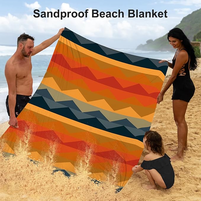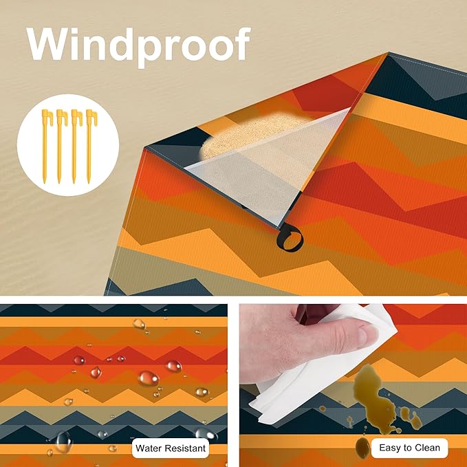 - Double Wind Resistant - Our geometric beach blanket comes with 4 stakes, easily plugged into sand or grass. Utilize the 4 corner sand pockets, fill them with sand or stones, and add weight to the windproof beach blanket. This double wind-resistant design ensures the sand-free waterproof beach mat stays securely anchored, even in windy conditions
