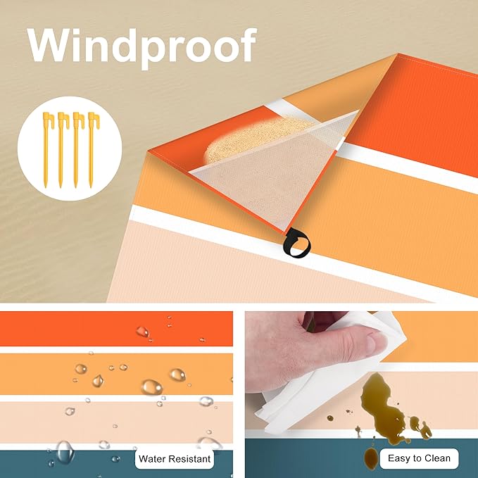 - Keep well in Place - No worries about your windproof beach blanket flying away; simply fill the built-in corner pockets with sand or use the 4 included ground stakes for extra peace of mind