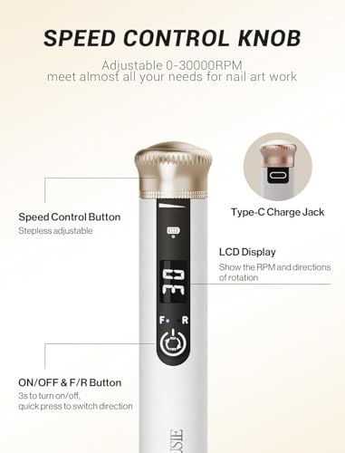 - LCD Display & Two-Ways Rotation: This stepless nail drill is embedded with a smart LCD screen that clearly displays running information in real time, such as rpm, direction, and battery status,providing clear and easy-to-read information at a glance.In addition,E-file with two-ways rotation, you can switch between clockwise and anti-clockwise directions to achieve your desired nail design.