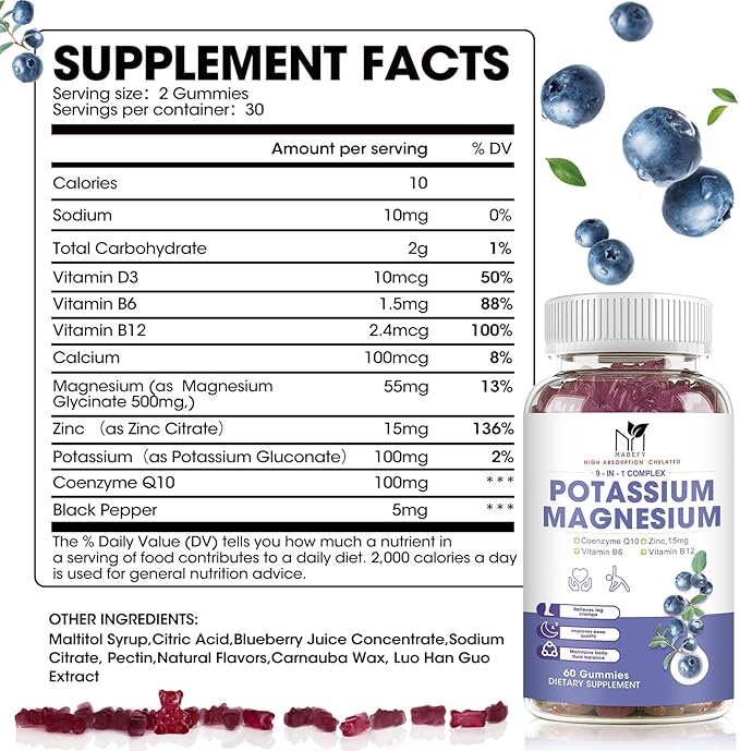 - Essential Daily Supplements: Taking 2 gummies per day-120 gummies will successfully supplement your magnesium potassium needs for 60 days! MABEFY Delicious Calcium Magnesium Potassium Supplement is suitable for women, men, and children. It boasts higher bioavailability and better absorption than capsules, tablets, or pills