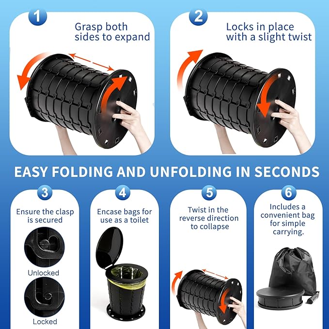 - [Convenient and Quick to Carry] - Imagine the discomfort when nature calls during an outdoor hike or the awkwardness of needing to change clothes. This portable toilet kit addresses those pain points. Simply pull and twist the portable toilet clockwise to use, and the changing room sets up swiftly. When finished, both collapse with a light press and fit neatly into our carry bag, making transportation a breeze.
