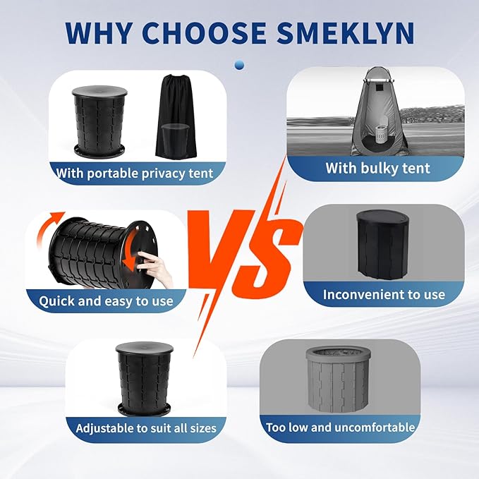 - [Adjustable Height for the Whole Family] - Embrace the outdoors with confidence with our SMEKLYN retractable portable toilet, now paired with a versatile changing room for complete privacy. The toilet's innovative fish scale structure allows for 8 height adjustments between 3.2 and 13 inches, ensuring a comfortable experience for every user, young or old, tall or short. offering a comfortable outdoor solution for the entire family.