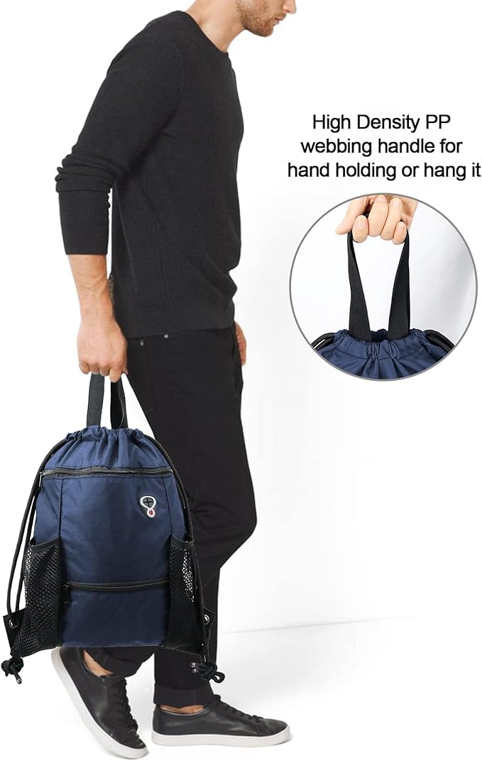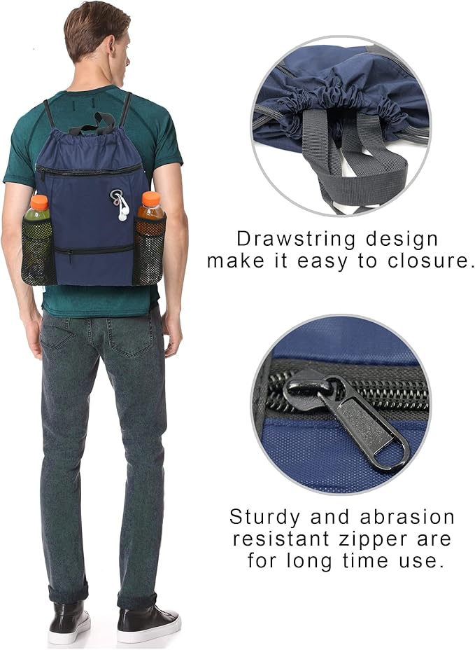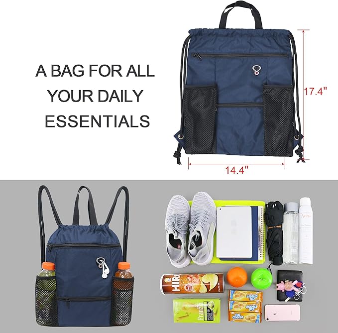 • CONVENIENT MULTI POCKETS:The front large zipper pocket of this drawstring gym backpack for kindle, ipadand so on, the front small zipper pocket great for towel,sunglasses and other small items. Besides, two sides mesh pockets allow you to place a water bottle or umbrella easily. And the inside zipper pocket can hold small valuables such as wallet, cellphone, credit card. etc. This is a drawstring bag for all your daily essentials.