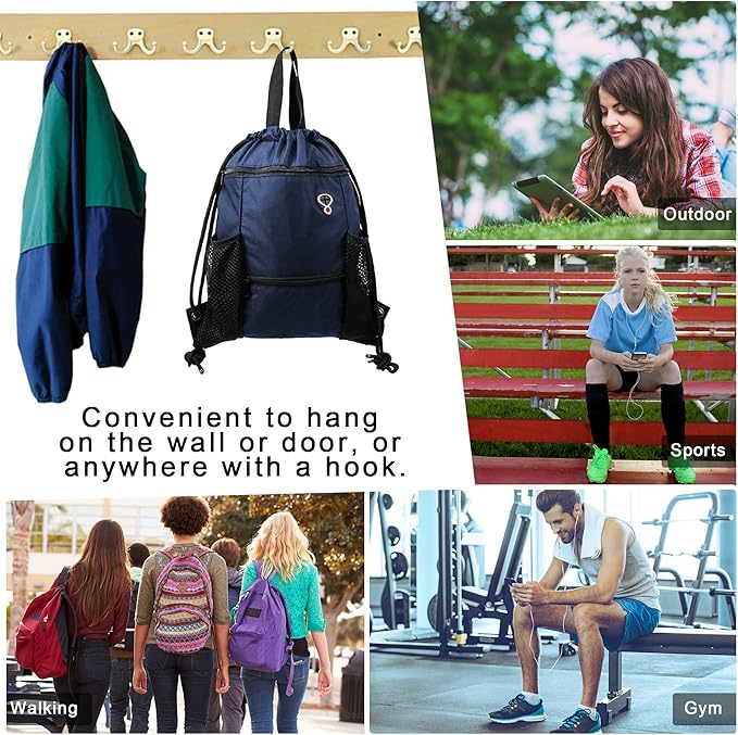 • HANDLE DESIGN and HEADPHONE HOLE: Our drawstring backpack bag has 2 high density PP webbing handy carry handles for hand holding or hang it, and it's convenient to hang on the wall or door, or anywhere with a hook. Also the headphone hole for easy listening on the go, add fun and convenience to your travel.