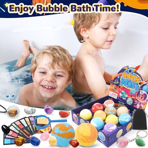 - Space Themed Bath Bombs for Kids - This bath bomb set is designed for kids who dream about space. Once dropped the bath bombs in water, they will float and fizz, giving the water a vibrant color and releasing essential oils aroma. The surprise gemstone toys also reveals when the bath bomb fizzes out, bring experience for boys and girls the best surprises when bathing time.
