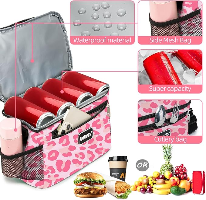 BEIMILY Lunch Box for Men/Women,Small Insulated Lunch Bag,Reusable Lunchbox for Work Picnic,Leakproof Soft Cooler Tote Bag Organizer with Adjustable Shoulder Strap for Adults(Pink Leopard Print)