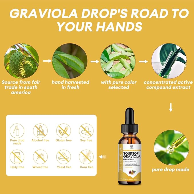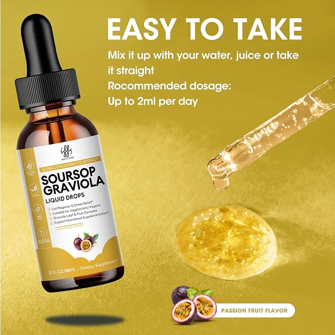 - Easy-To-Take Liquid Soursop — Take 2ml vegan drops daily, 30 days supply. Shake well before use. Can take it directly, or add it to water or any drink for most lifestyles. Our soursop graviola liquid dropss are carefully made with passion fruit flavor and high absorption, bringing the highest benefits to you and your family!