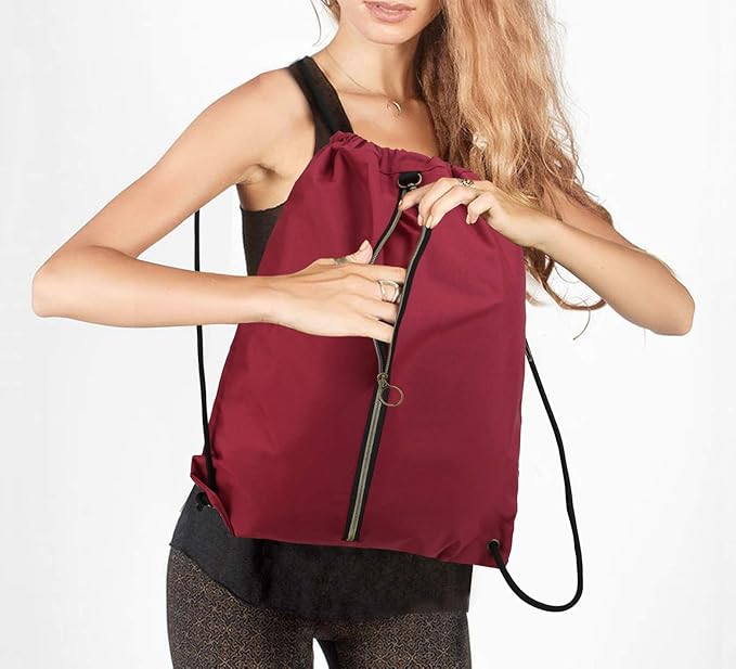 - 【CONVENIENT MULTI POCKET】::Our drawstring backpack includes 5 additional pockets. 1 large zipper additional pockets on the front of the drawstring bag for towels, clothes, small umbrellas or other items. 1 zipper pocket on the backside of the sports bag for women for holding small valuables like mobile phones, wallets, etc, 2 built-in pockets can separate items which can hold slippers and water glasses. 1 inside zip pocket for keys. It is safe for you to take the items conveniently.