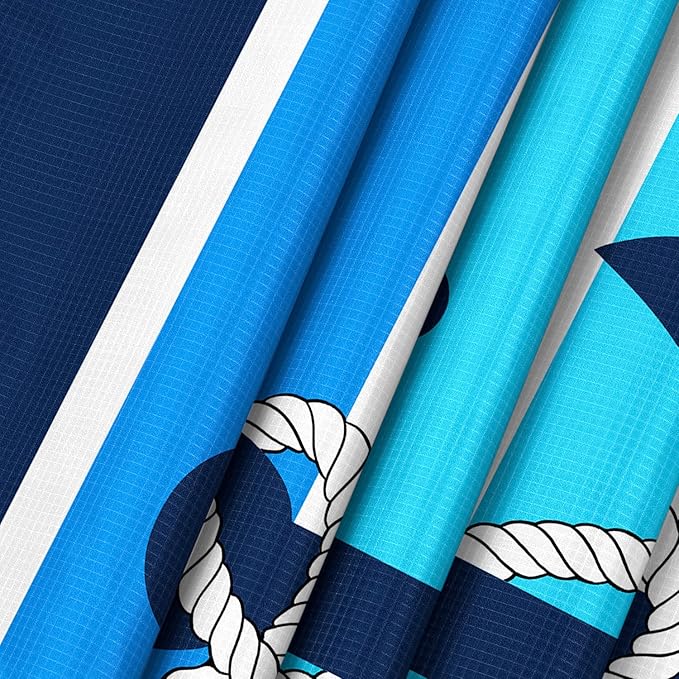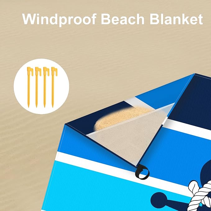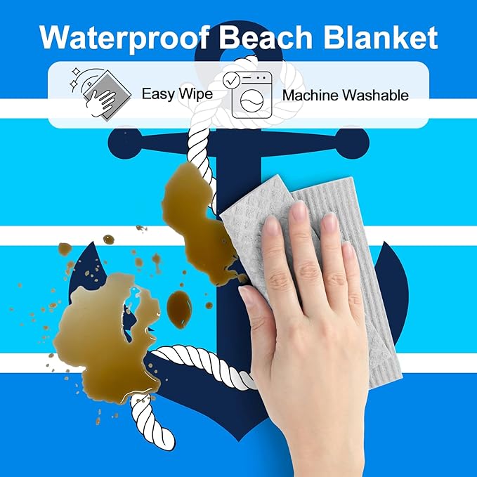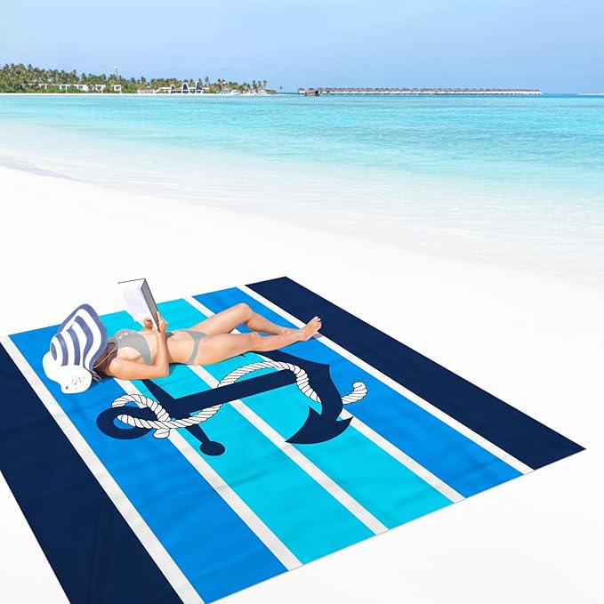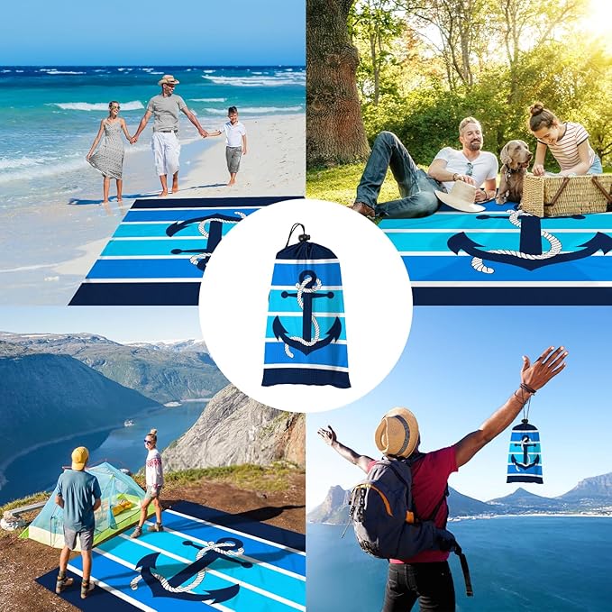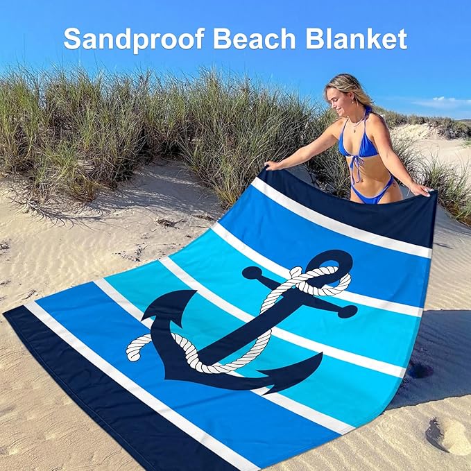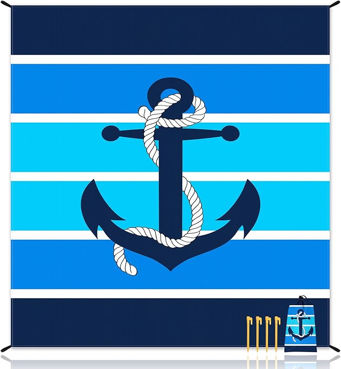 - Add Ocean Charm - Lay out a blue nautical beach blanket on the beach adorned with multiple layers of soothing blue stripes, each reminiscent of the depth and serenity of the ocean. With an anchor motif at the center of the large beach blanket, you'll feel a sense of groundedness and calmness envelop you, anchoring you in the present moment and completely surrendering to the beauty and serenity of the beach