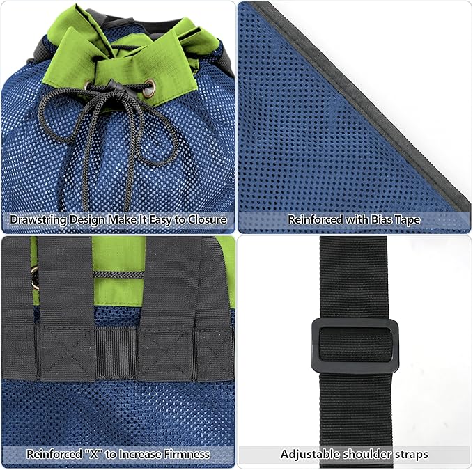 - 【LARGE CAPACITY & STURDY】-- This mesh swim bag measures about W19.6' X H15.7', big enough to protect and organize your equipment such as workout gear, gym gear, swimming gear, sports gear, beach gear, and pool gear. We used reinforced X-stitches for the shoulder straps so that the sports bag wouldn't tear when it was full of items. The fabric of our workout gear bag is also made of rip-proof material so that the sports backpack is sturdy and can be used for a long time.