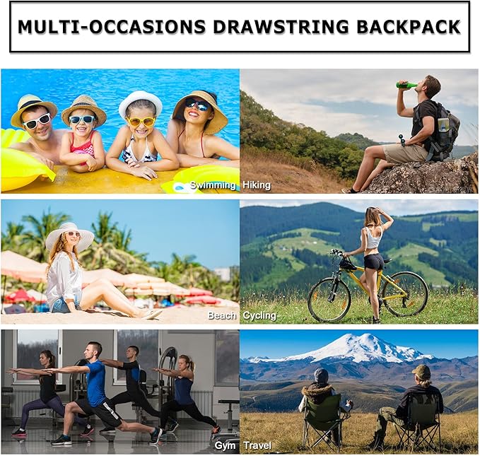 • MULTI-FUNCTIONAL & MULTI-PURPOSE: Our pool bag is also a fabulous gift for swimmers, men and women. Our string bag is made for convenience while hauling all of your gym gear, swimming gear, beach gear, and swim gear. And the string backpack works perfectly for the pool, beach, or swim team. Our drawstring gym bag is perfect for the gym bag, swim bag, basketball bag, soccer bag, sports bag, or beach gear bag.