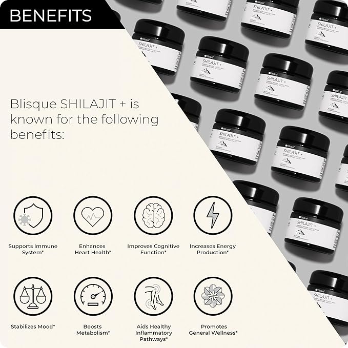 • PROMOTE OVERALL WELL-BEING: Blisque SHILAJIT + is a comprehensive supplement that enhances your well-being. It will support your immune system, improve heart health, act as a brain booster, supercharge you with energy, stabilize your mood, and aid a healthy inflammatory response.*