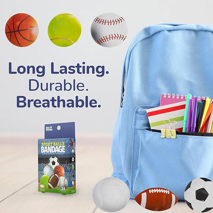 - SPORT BALL BANDAGES: This 24 piece pack of Sports Balls bandages feature fun baseball, football, volleyball, tennis ball, soccer ball, and basketball shapes, and is great for putting a smile on kids' faces while protecting wounds such as cuts, scrapes, and burns; sticky bandages come in a cute cardboard box and are perfect for kids and adults alike, and also for school nurses and pediatric doctors