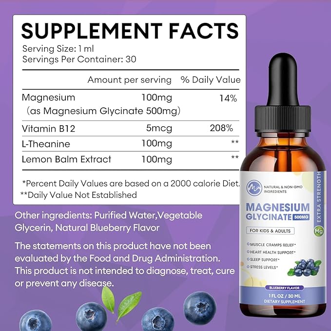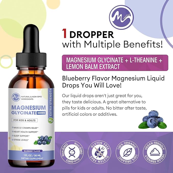 - Magnesium Liquid Drops Supplement – Formulated with 500mg of magnesium glycinate, which experience enhanced stress resistance, a calm mood, and better sleep. Enhanced with L-Theanine and Lemon Balm, supports brain health, bone formation, and energy, also helps you digest food well, and takes care of your heart.