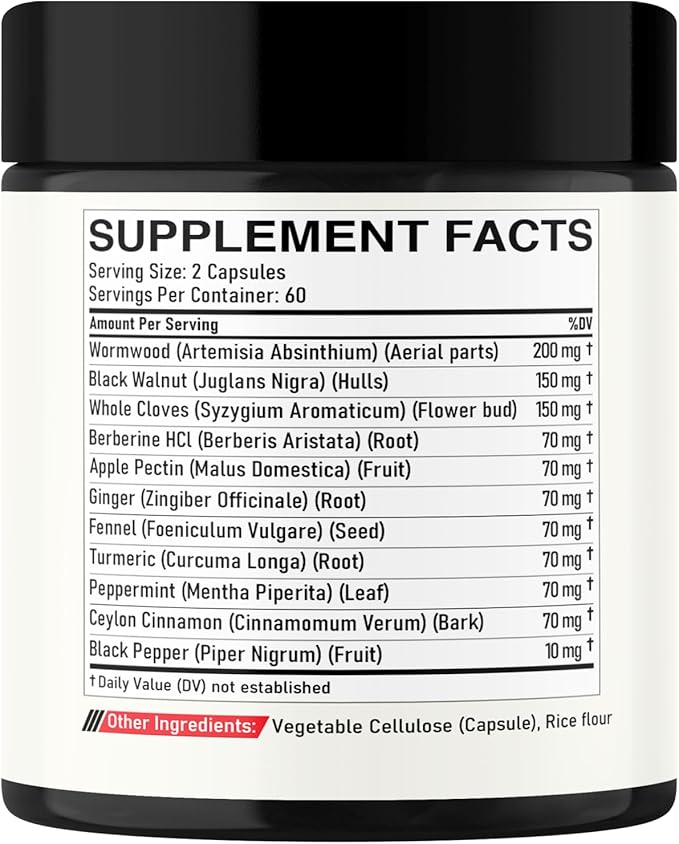 - π We take pride in delivering superior supplements with unparalleled benefits. With a rich historical usage, Wormwood stands as a testament to our dedication to crafting quality products. Backed by years of Our formula comprises 11 potent herbal ingredients, featuring Wormwood, Black Walnut Hulls, Whole Cloves, Berberine HCl, Apple Pectin, Ginger Root, Fennel Seed, Turmeric Curcumin Root, Peppermint Leaf, Ceylon Cinnamon Bark, and Black Pepper.