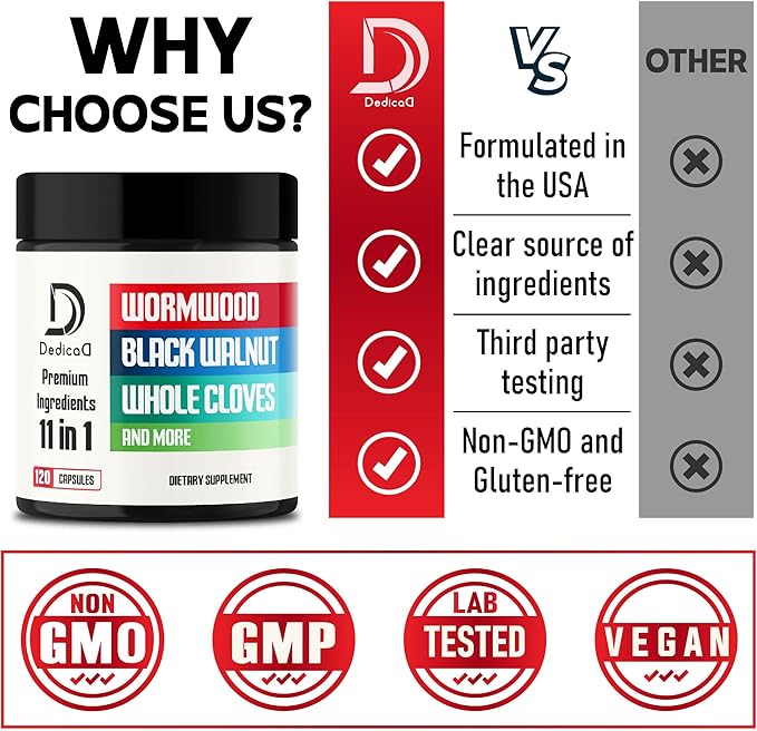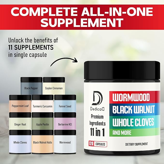 - π DedicaD Wormwood Capsules offer an impressive 1000mg of exceptional strength daily, providing an advanced blend for supporting a healthy lifestyle. Experience the remarkable benefits of our potent Wormwood Powder Extract without the need to consume a large quantity of Wormwood vegetables with an unpleasant odor that may be hard to swallow.