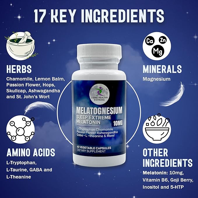 - Advanced sleep formula: Experience restful sleep with our 17 in 1 melatonin natural sleep aid, specifically formulated for adults. This drug-free, non-habit forming supplement promotes rejuvenation and a natural sleep cycle.
