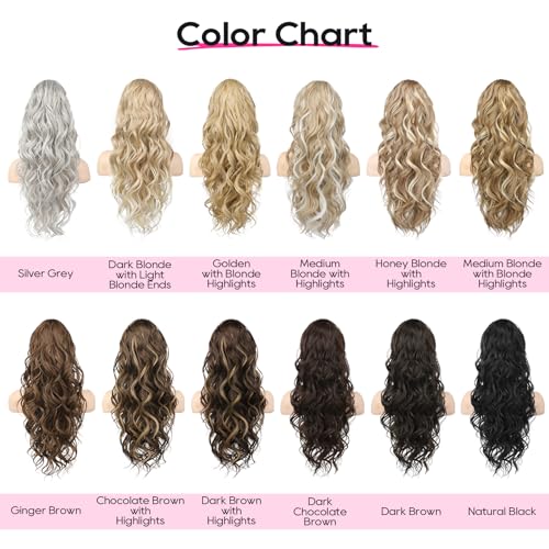 REECHO Ponytail Extension, 24" Claw Clip in Ponytail Extensions Long Curly Wavy Ponytail Hair Extension Jaw Clip on Pony Tails Hairpiece for Women - Medium Blonde with Blonde Highlights