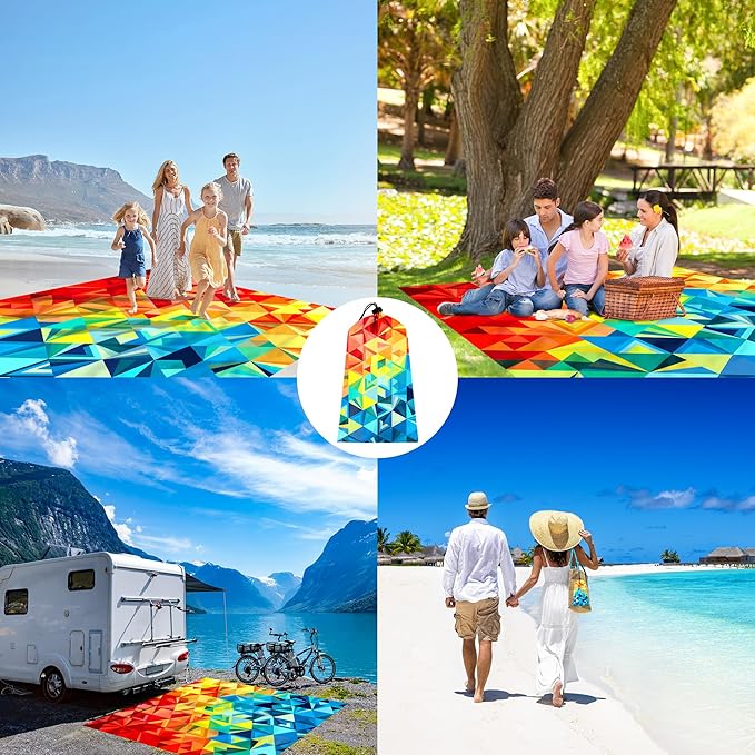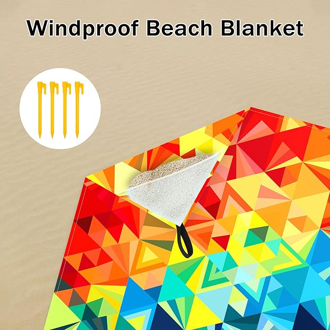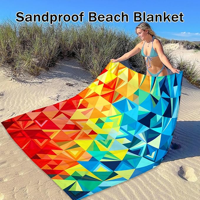 - Enjoy the Sun in Style - With its colorful triangle block design, the beach blanket stands out from the crowd. Each triangle boasts its unique hue, creating a gorgeous mosaic. Bold and vibrant colors range from the deep blue of the ocean to the fiery orange of the setting sun. Taking a moment to relax and rejuvenate in magnificent nature is possible with the SkyNature colorful beach blanket