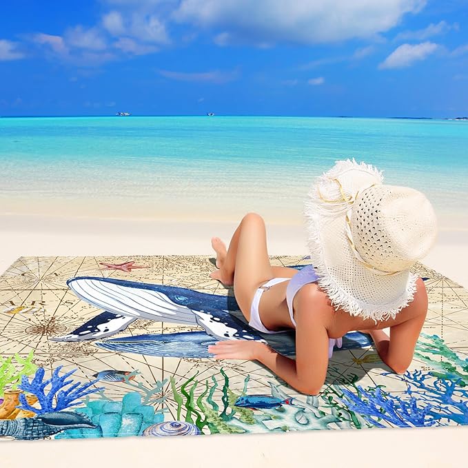- 【Stylish Beach Blanket & Easy Maintenance and Cleaning】This oversized beach blanket is stylish and eye-catching, with a unique print pattern - sea world, turtles and whales to make you stand out on the beach! You can easily find your family and friends on the beach without worrying about getting lost. For deeper cleaning, it's machine washable, ensuring that it stays fresh and ready for your next outdoor adventure.