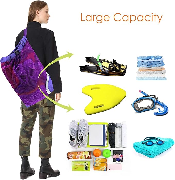 - ADJUSTABLE SHOULDER STRAP & SECURE DRAWSTRING CLOSURE: The large mesh beach bag has an adjustable carrying strap, whether adults or youth can adjust them to the length that suits themselves. Sling design can free up your hands, and a durable wide strap avoid digging into your shoulders and help reduce your shoulder burden. Besides, the swim pool bag is a drawstring design to store gear easily and take them out quickly.