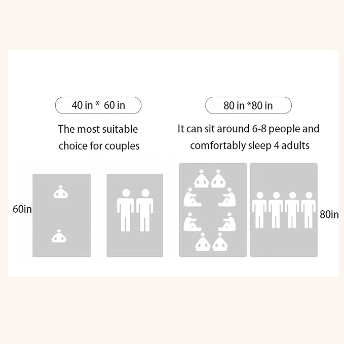 - [Easy to carry and compact design] : Oversized picnic MATS are available in two sizes. The 80 'x 80' size can accommodate 4-6 adults. The 60 'x 40' size can accommodate 1-2 adults. The picnic mat can be folded into a lightweight and small handbag with a handle, which is easy to carry and comes with Velcro, which can be easily rolled out by tearing it