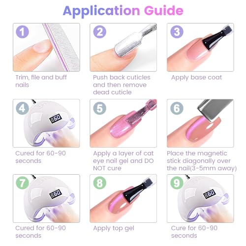 - EASY TO USE:This cat eye gel polish is made with with natural resin ingredients,magnetic shimmers,and a resin formula,so this gel polish set won't cause smudges cracks, or chips.It can last for 21 days with perfect shine under proper application