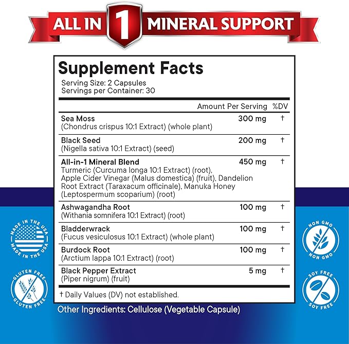 - Our Promise & Trusted Ingredients - We pride ourselves in offering quality seamoss raw, black seed oil health benefits, ashwagandha root, burdock root, and bladderwrack supplements for our customers. Our seamoss capsules, black seed cumin and ashwangha supplements formulas are proudly made in the USA in a registered and certified facility to create trusted seamoss all in 1 capsules, black seed cumin oil, ashwagandha for men and bladderwrack supplement. No unneeded preservatives or fillers.