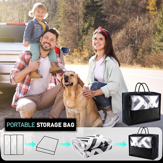 - Easy-Pack Storage Bag: Come with 4x rug stakes to keep the wind from blowing the mat away and hold it securely in place. You can also use the outdoor carpet for RV travel, picnic, beaches and pool decks. With the carrying bag, this camping rug is easy to transport and carry around, so you can take it with you on picnics, beach and RV trips to enjoy a relaxing outdoor time. Modern, versatile and sleek geometric design add ambience to your indoor outdoor space. LED strip lights illuminate dankness.