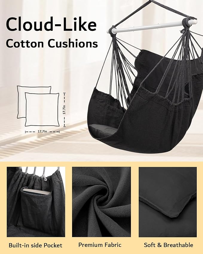- HEAVY-DUTY DESIGN: Unlike other hanging rope loungers that can only accommodate up to 330 lbs, our hammock chair swing for bedroom is tested and rated by SGS with a max. load of 500 lbs. When it comes to your family's safety, choose this ultra-strong swing chair instead of other fragile outdoor hammock chairs