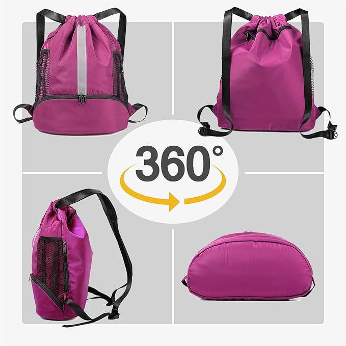 - SEPARATE WET POCKET & SHOE COMPARTMENTS: This drawstring bag has a wet pocket on backside for storing damp items like toiletries and wet towels, keeping other items dry and organized. And there is an enlarged shoe pocket at the bottom, which is perfect for storing sneakers or high-top basketball shoes.