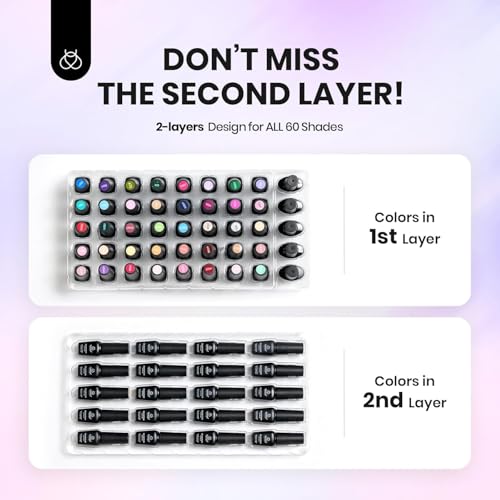- Beetles 60 Color Gel Set: With the beetles gel nail polish set, you get 60 classic and fashionable colors , 2 x 7.5ml gel base coat and 2×glossy & matte Top Coat, 1 x Nail Buffer , 1 x Nail File, 1 x Nail Clipper , 1 x Cuticle Stick, to suit all occasions and seasons. Whether it's a casual day, a gathering with friends or a ceremonial event, these beetle gel nail polish colors can match any look you wear.