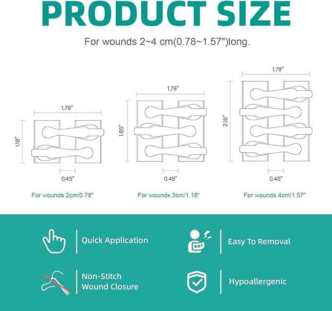 - APPLICABLE SIZES: 2 Strips - For wounds 2cm/0.78', 3 Strips - For wounds 3cm/1.18', 4 Strips - For wounds 4cm/1.57'. After using the wound closure strips, apply this dressing to protect the wound. It is recommended to close the wound urgently after injury or to reduce wound tension after surgery to reduce scar formation. USE AFTER SURGERY MUST FOLLOW THE DOCTOR'S ADVICE.