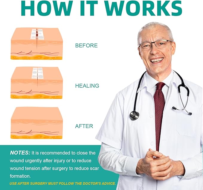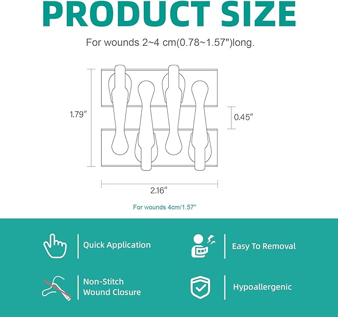 - WOUND CLOSURE STRIPS: It is a non-invasive, painless, alternative to stitches. The laceration closure kit is more convenient than traditional stitches. The device can reduce tension, reduce hyperplasia and beautify wounds, and is ideal for sensitive skin and kids, ensuring a safer and faster recovery.